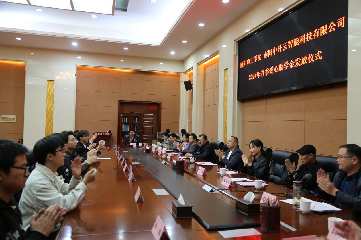 本网讯(特约记者/张鑫)4月30日下午,由学生资助管理中心、教育发展基金会和南阳中开云智能科技有限公司联合开展的爱心助学金发放仪式在学校会议中心举行。南阳中开云智能科技有限公司董事长程海波,学生处、学生资助管理中心、教育发展基金会负责人,智能制造学院、信息工程学院、计算机与软件学院、数字媒体与艺术设计学院等学院党委副书记、资助专干、受资助学生和学生代表参加仪式。