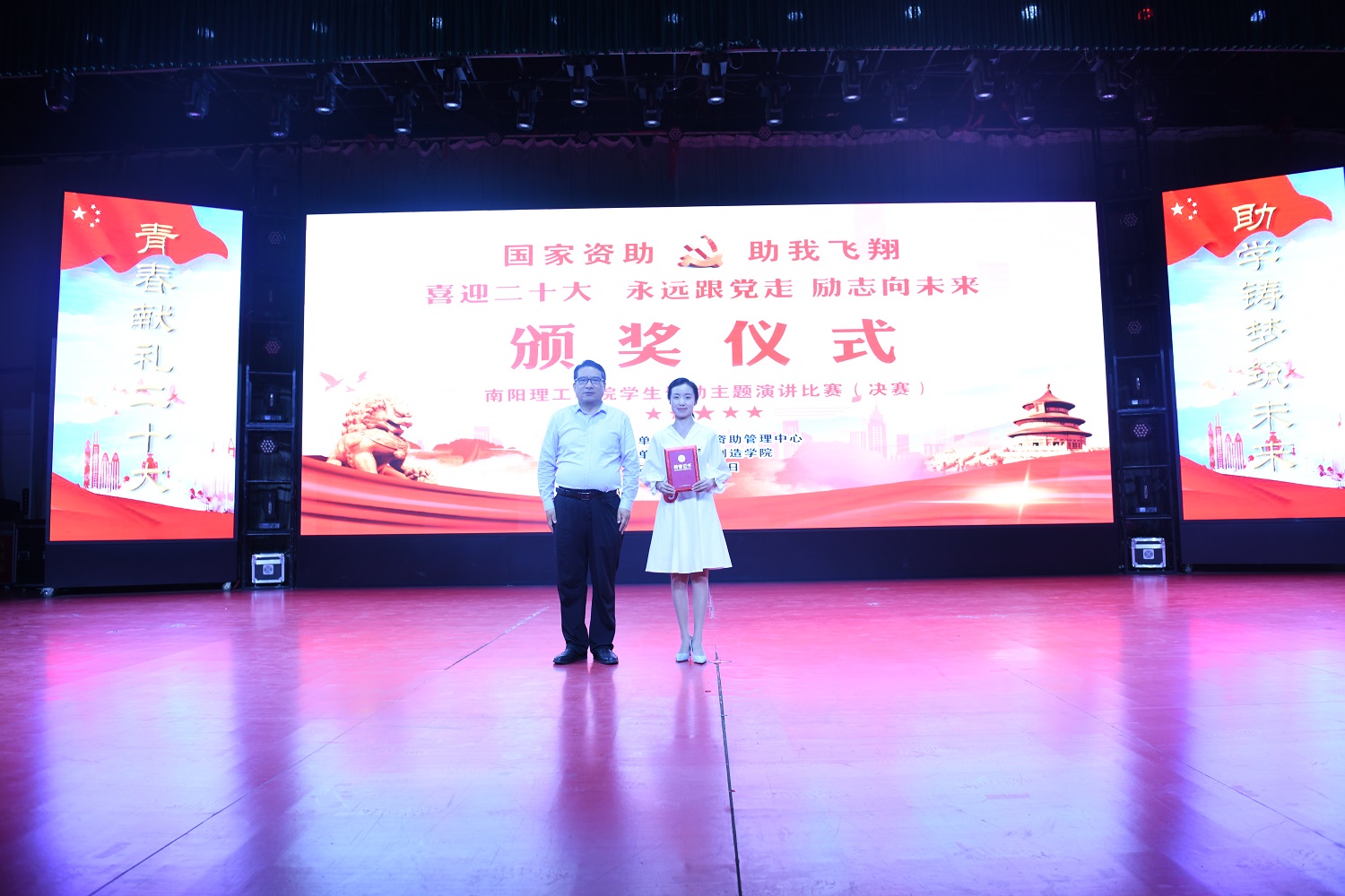 本网讯(特约记者/徐庆栖 王文博)为积极营造喜迎党的二十大的浓厚氛围,培育受助学生的爱党爱国情感和感恩意识,5月24日,我校在毕业大厅举办“喜迎二十大 永远跟党走 励志向未来”学生资助主题演讲比赛决赛暨颁奖典礼。副校长葛晨光出席活动并颁奖。学生处、宣传部相关领导、各学院学生工作负责人、辅导员及学生代表参加活动。