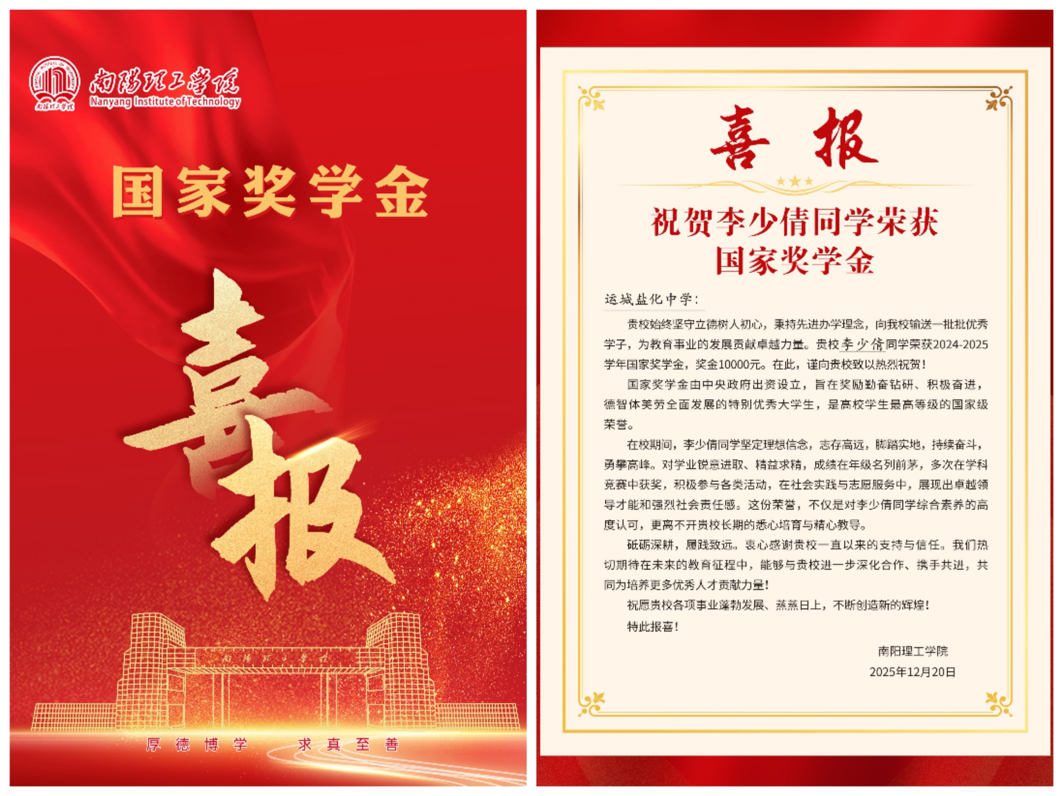 对高中母校而言,喜报是育人成果的生动回馈,更是校际协同育人的温情纽带。山西省吕梁市孝义市第七中学校寄来感谢信,信中写道,2019届毕业生宋俊锋获此殊荣,既是学子个人拼搏的成果,更是两校育人理念传承与协同育人成效的见证,期待与我校深化合作、共育时代英才。河南省平顶山市实验高中老师李淑梅欣慰地表示,冀艺晨的成长与成就,印证了南阳理工学院的育人理念与培养质量,“不甘示弱”的南工精神已融入学生的成长底色,成为学生前行的动力,未来会推荐更多学子奔赴这片梦想沃土。