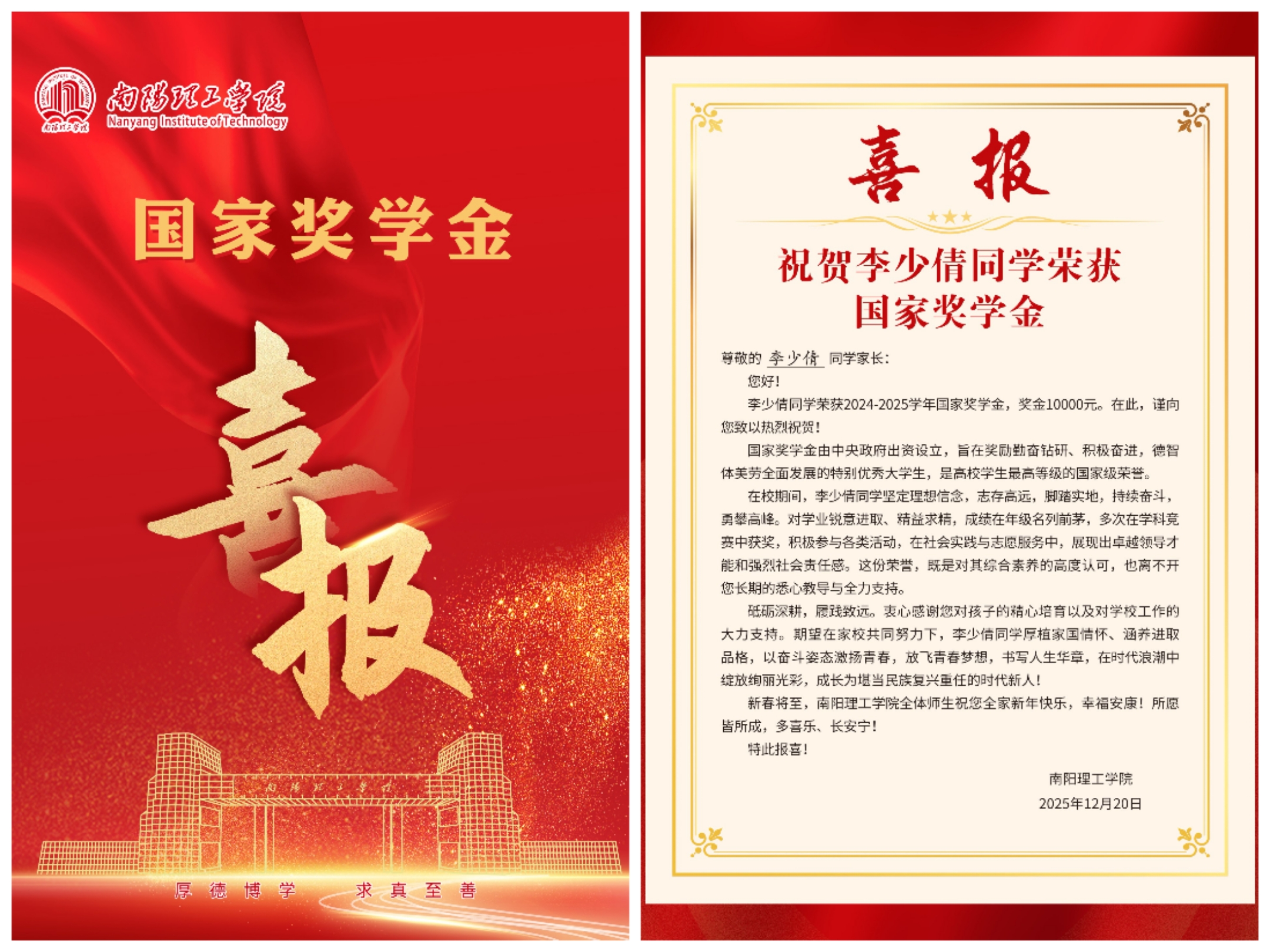 一封喜报,承载初心;一纸荣光,凝聚合力。多年来,南阳理工学院始终坚持立德树人根本任务,构建物质帮助、道德浸润、能力拓展、精神激励相融合的资助育人机制,以精准帮扶筑牢求学根基,以荣誉激励指引成长方向。此次喜报寄送工作,正是我校延伸资助育人内涵、构建家校校际协同育人体系的具体举措,既凝聚了育人共识,更激励了广大青年学子追梦不止、踏实奋斗,在青春赛道上逐光而行、绽放芳华!(校对/胡玲 审核/郭兴华 )